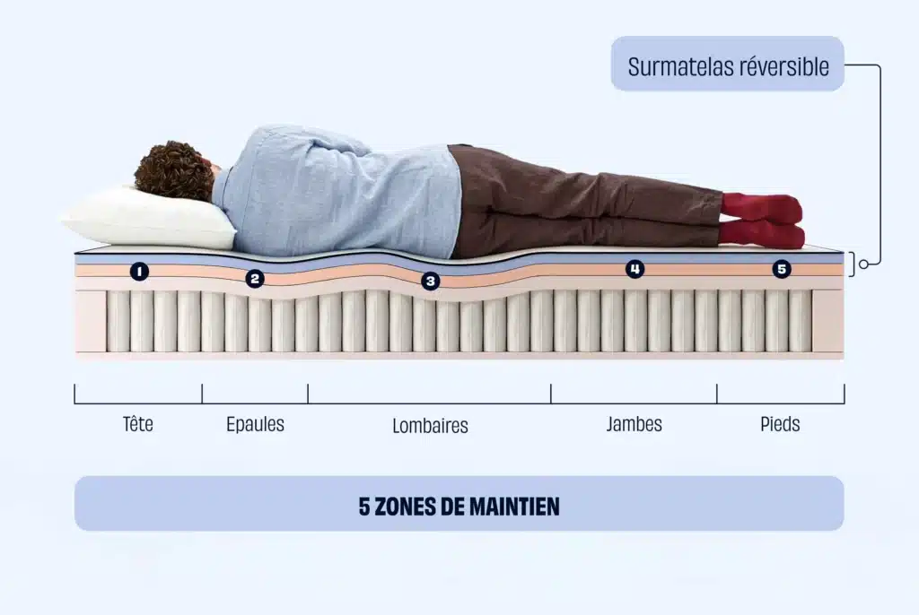 - 5 zones de confort : Les ressorts sont répartis en 5 zones distinctes pour offrir un soutien précis là où le corps en a besoin (épaules, bassin, jambes).